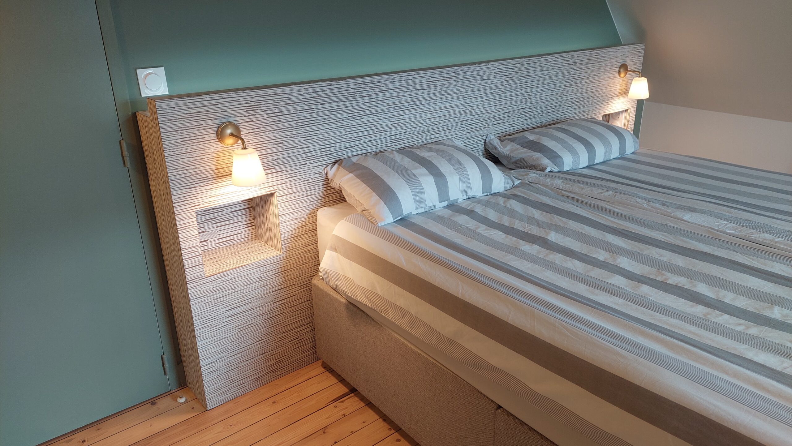 Dans cette maison située à Rennes, nous avons conçu et réalisé une tête de lit en stratifié Oberflex Noyer nuance naturelle. Elle intègre deux niches de chaque côté du lit, chacune équipée d’un interrupteur permettant de contrôler l’éclairage de la pièce, ainsi que de prises électriques avec ports USB type C.