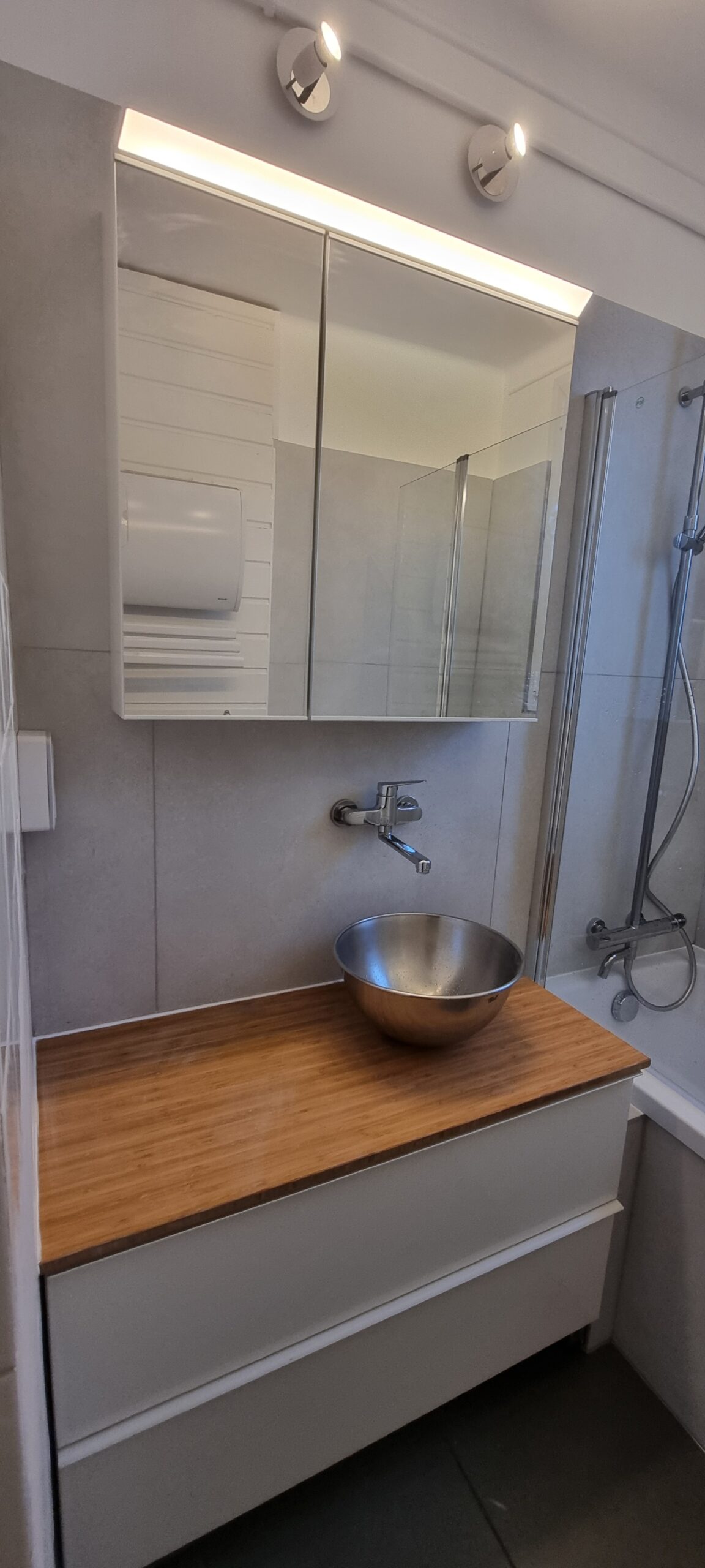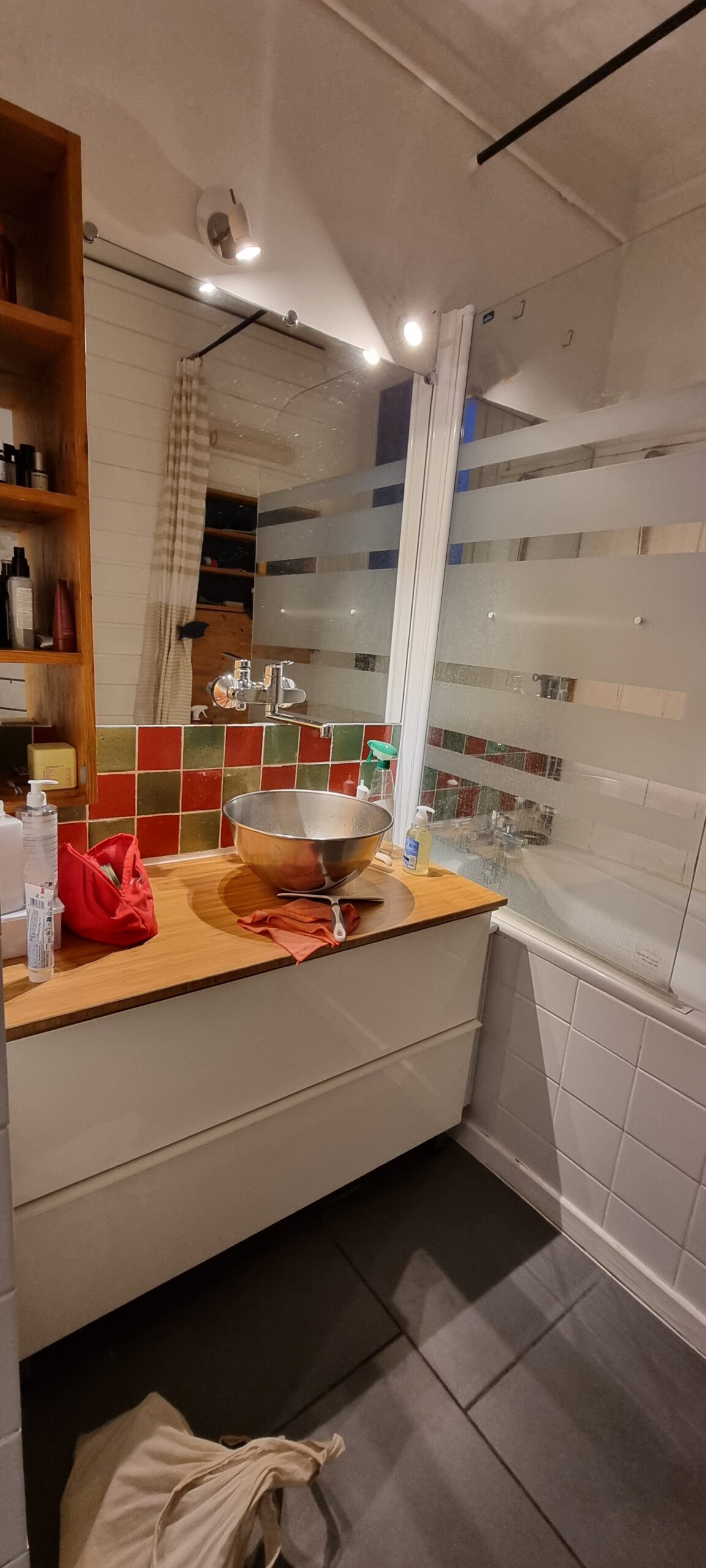 Le choix des nouveaux équipements a été guidé par deux impératifs : la qualité des matériaux et la réduction des risques d’infiltration futurs. Pour la baignoire, notre choix s’est porté sur un modèle en résine composite, un matériau qui s’impose de plus en plus dans les rénovations. Plus légère que la fonte, plus résistante que l’acrylique classique, la baignoire en résine offre une excellente isolation thermique — l’eau y reste chaude plus longtemps — ainsi qu’une surface lisse, non poreuse, facile à nettoyer et résistante aux chocs et aux rayures. Son esthétique épurée et contemporaine s’intègre parfaitement dans une salle de bain moderne.