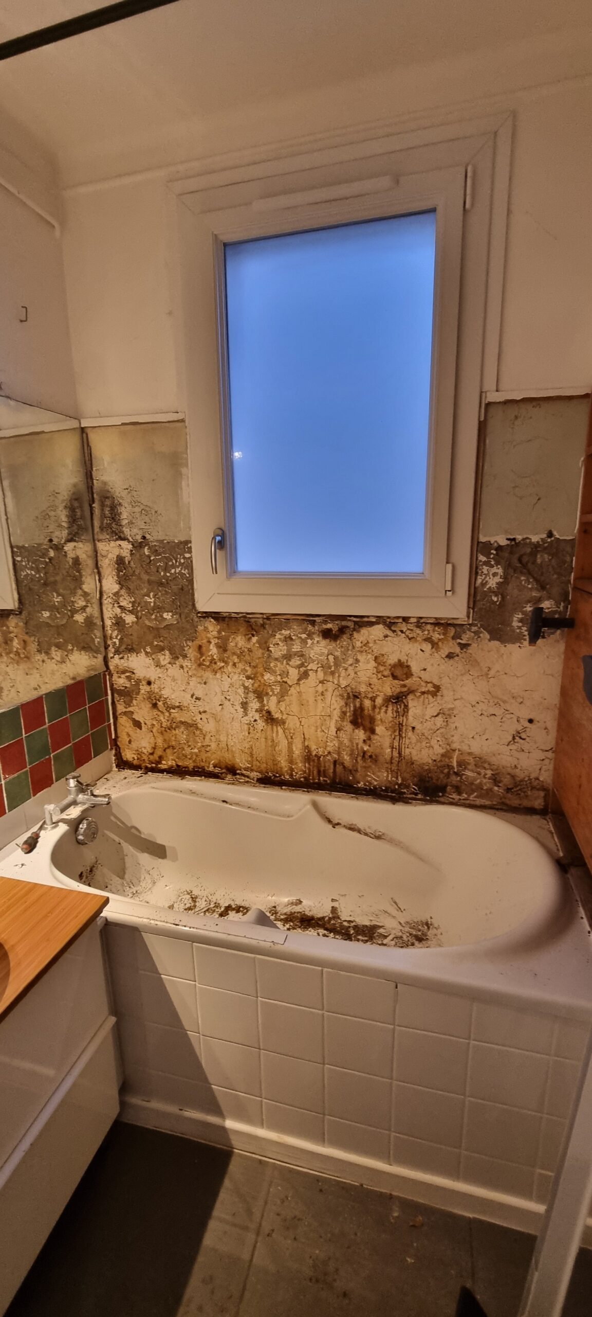 Tout a commencé par un constat visuel simple : des joints noircis, craquelés, décollés par endroits, laissant présager des infiltrations répétées au fil des années. Ces joints, pourtant discrets, jouent un rôle fondamental dans l’étanchéité d’une salle de bain. Lorsqu’ils se dégradent, l’eau s’infiltre progressivement derrière le carrelage, dans les murs, sous le receveur ou autour de la baignoire. Le problème est alors invisible à l’œil nu… jusqu’au jour où les travaux de démolition révèlent la vérité.C’est exactement ce qui s’est produit ici. Lors de la phase de démolition et de dépose de l’ancien carrelage, nous avons découvert la présence de champignons et de moisissures dissimulés derrière les revêtements. Une situation malheureusement fréquente dans les salles de bain insuffisamment ventilées ou victimes de micro-fuites chroniques, mais qui nécessite une prise en charge immédiate et rigoureuse.